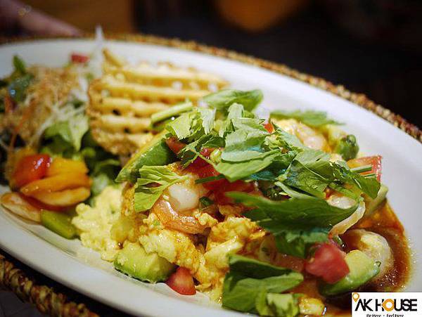 酪梨鮮蝦蛋蓋飯,320泰銖。這道蓋飯用了酪梨入菜,加上蕃茄、鮮蝦一同炒飯,整體非常清爽,很有炎熱的泰國風。飯使用的是日本米,Q度很好。