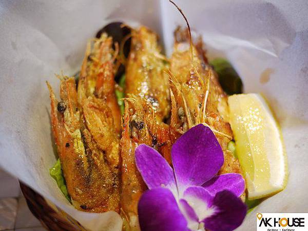 香蒜蝦,270泰銖。融合美、日、泰式作法,將大頭蝦裹麵粉再炸,可做成蒜香或奶油兩種,有點像是避風塘烤蝦的西式版。若多人一同點餐,可以作為開胃菜之一。