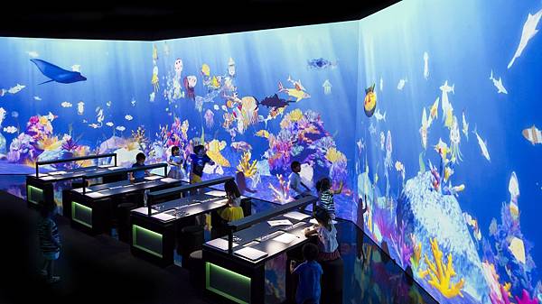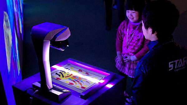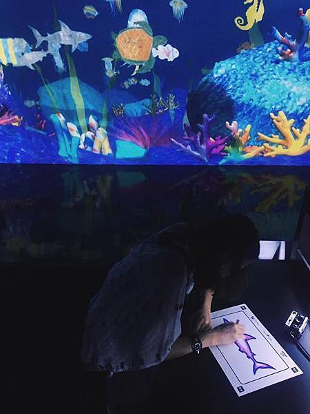 小朋友可以自由發揮創意,在平面的紙上把各種海洋生物填上顏色,然後交給工作人員,就會會投射牆上,自己親手畫的魚類就會變成3D的魚,在螢幕上的海洋世界中游來游去。